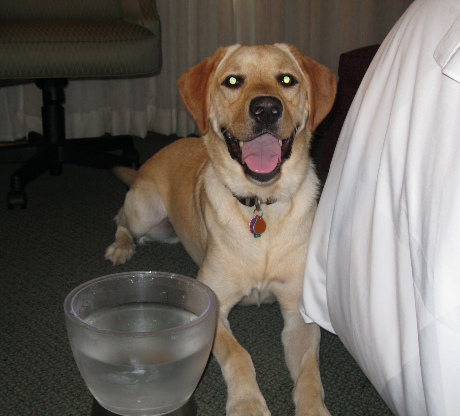 Like most weekends, Saturday started with a run and ended with a late night potty break. Sandwiched between those two events were the uncommon: four hour car ride, lunch at a restaurant, elevator rides, wedding, and party complete with conga line.We didn't pack all Monte's supplies, so we improvised. The ice bucket makes a classy water bowl. It only look a few attempts before he stopped looking for hot dogs or ice. However, that's all it takes to spill half the water on the floor.